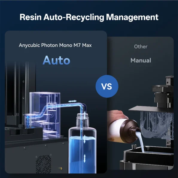 Otomatik Besleme ve Geri Dönüşüm Yönetimi: Reçine seviyesi azaldığında sistem otomatik olarak hazneyi doldurur, baskı tamamlandığında fazla reçineyi geri toplar. Bu özellik, malzeme israfını önler ve sürekli üretim için kesintisiz akış sağlar.