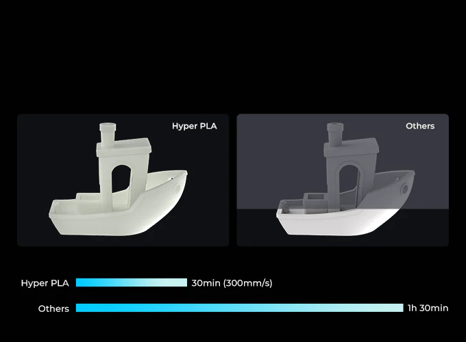 Hyper Series PLA, özel formülündeki yüksek akışkanlık ve hızlı soğuma özellikleri sayesinde 600 mm/s’ye kadar baskı hızını destekler. Akışkan yapı, filamentin sorunsuz eriyip ekstrüde olmasını sağlarken; hızlı soğuma, katmanların anında sertleşerek biçimini korumasını mümkün kılar. Böylece yüksek hızda bile net detaylar, güçlü katman birleşimi ve pürüzsüz yüzey kalitesi elde edilir.