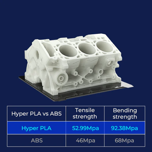 Hyper Series PLA, ABS’ten daha yüksek çekme mukavemeti ve geleneksel PLA’dan daha fazla darbe dayanımı sunar. Bu sayede modeller, yüksek hızda basıldığında bile yapısal bütünlüğünü korur ve daha iyi yük taşıma kapasitesi elde eder. Dayanıklılığı artırılmış formül, hem fonksiyonel prototipler hem de uzun ömürlü parçalar için üstün performans sağlar.